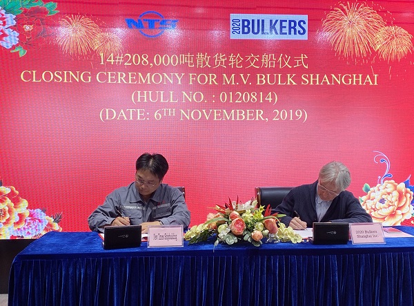 On November 6, 2019, the closing ceremony for 14# 208,000 DWT Bulk Carrier was held at the meeting room on 8th floor of New Times Office Building. Our Executive General Manger Mr. Zhang Yuyong and the representative from 2020 Bulkers Ltd. attended this ceremony. The vessel was smoothly and successfully delivered by us and accepted by the Buyer.