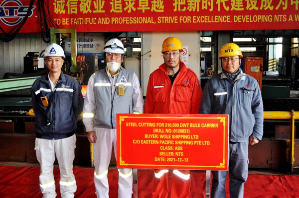 On December 13, 2021, the steel cutting of two units of 210,000 DWT Bulk Carriers bearing builder's hull nos.0120831 and 0120845 has commenced. Our Head of Production Department Mr. Chen Yuefeng, QC Manager Mr. Qin Feng, representatives from EPS Site Manager Mr. Ni Jie together and representatives from ABS classification society attended and witnessed this event.