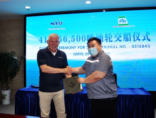 On June 29, 2022, the closing ceremony was held at the meeting room on 8th floor of New Times Office Building for one unit of 156,500 DWT Crude Oil Tanker with Builder's Hull No.0315841 that was built for Pantheon Tankers. Our Executive Deputy General Manager Mr. Zhang Yuyong, Deputy General Manager & Executive Director Mr. Yuan Heng and the Owner's Representative Mr. Chachamopoulos Ioannis attended this ceremony. The vessel was smoothly and successfully delivered by us and accepted by the Owner.