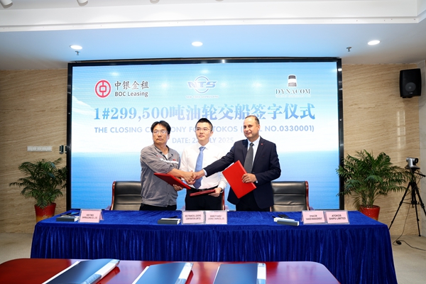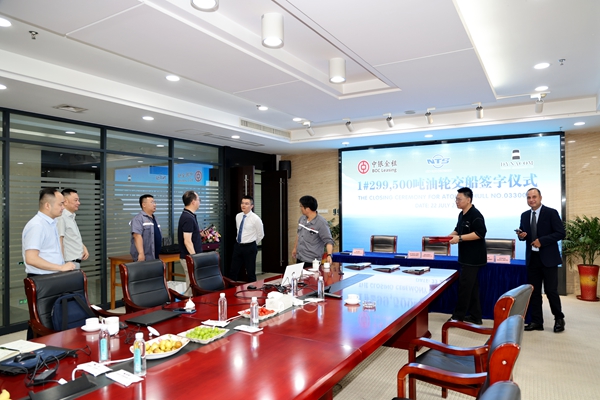 On July 22, 2025, the closing ceremony for 1# 299,500 DWT Crude Oil Tanker bearing the builder's hull no.0330001 was held at the meeting room on the 8th floor of New Times Office Building. The representatives from the Owner Dynacom and BOC Financial Leasing Corporation Limited attended the event. The delivery documents were jointly signed by the company's Executive Deputy General Manager Mr. Zhang Yuyong, the Owner's representative Mr. Romeo Mustata and Mr. Shi Yihang from BOC Leasing. The vessel was smoothly and successfully delivered by us and accepted by the Owner.