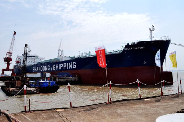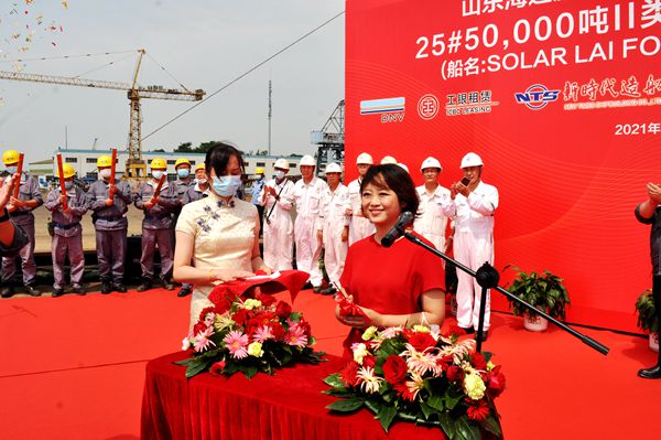 On August 23, 2021, e-closing for 25# 50,000 DWT Product Oil/Chemical Tanker (IMO II Type) was held at the meeting room on 8th floor of New Times Office Building. Our CEO Mr. Liu Haijin and Deputy General Manager & Executive Director Mr. Yuan Heng were present. Mr. Zhang Yuyong Executive Deputy General Manager of New Times Shipbuilding Co., Ltd., Mr. Xu Tao Vice General Manager of Shandong Shipping Corporation signed the delivery documents via video and email. The vessel was smoothly and successfully delivered by us and accepted by the Owner. On the same day, Godmother Mrs. Chen Wenlei named the vessel for "SOLAR LAI FONG".