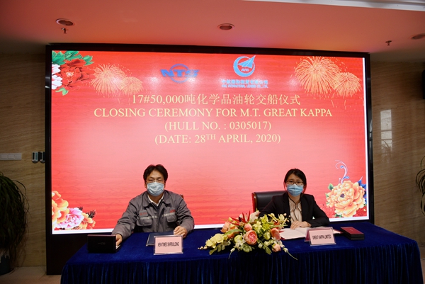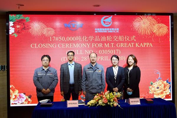 On April 28, 2020, the closing ceremony for 17# 50,000 DWT Product Oil/ Chemical Tanker was held at the meeting room on 8th floor of New Times Office Building. Our CEO Mr.Liu Haijin, Executive General Manger Mr. Zhang Yuyong, the representives from AVIC International Leasing Co., Ltd., Ms.Chen Zhengrong and Ms.Zhou Wenjing  attended this ceremony. The vessel was smoothly and successfully delivered by us and accepted by AVIC.