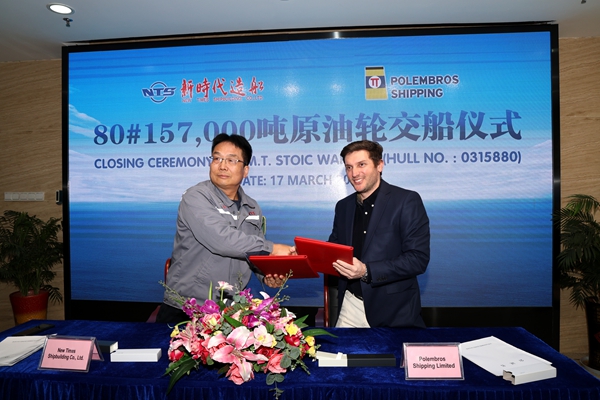 On March 17, 2025, the closing ceremony for 80# 157,000 DWT Crude Oil Tanker bearing builder's hull no.0315880 was held at the meeting room on 8th floor of New Times Office Building. Our CEO Mr. Liu Haijin, Executive Deputy General Manager Mr. Zhang Yuyong and the owner's representatives from Polembros Shipping Limited were present. The vessel was smoothly and successfully delivered by us and accepted by the Owner.
