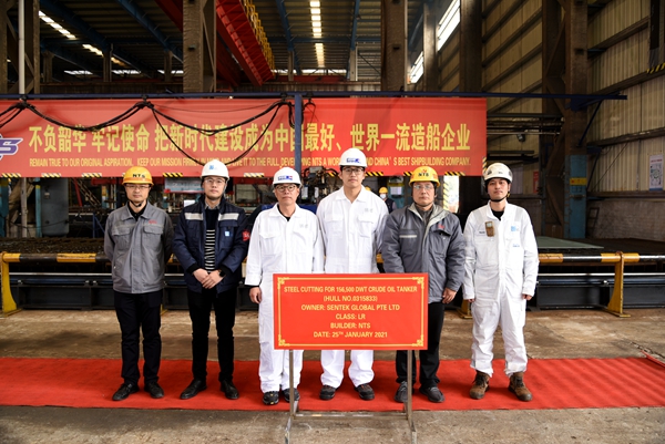 On 25 January, 2021, the steel cutting ceremony of No.33 156,500 DWT Crude Oil Tanker has been carried out successfully by New Times Shipbuilding Co., Ltd. Our Executive General Manager Mr. Zhang Yuyong, Deputy General Manager Mr. Zhu Hangang, Mr.Pai Hong Boon as the representative from the owner Sentek Global Pte LTD. and representatives from LR classification society attended this event.