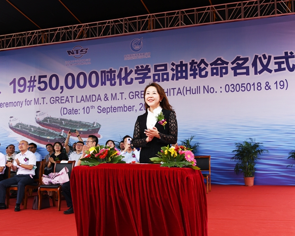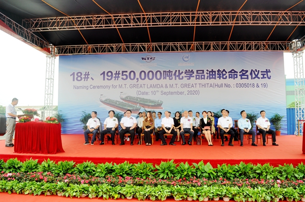 On September 10, 2020, we held naming ceremony for two units of 50,000 DWT Product Oil/ Chemical Tankers with Hull Nos.0305018/19 those were built for AVIC and charterered to Navig8. Our CEO Mr.Liu Haijin, Board Director Mr. Yuan Heng, Executive General Manger Mr. Zhang Yuyong, Deputy general manager Mr. Zhu Hangang, Assistant General Manager Mr. Xu Zhenyu, and guests from AVIC: God mothers Miss Gu Liangyu and Ms.Zhou Wenjing, Vice President Mr. Li Jun, Deputy Manager of Shipping Division Mr.Yang Guangyi , Navig8 Chief Representative Mr. Gordon Shen and its site team manager Mr.Binod Kumar and KR General Manager of KR Shanghai Branch Mr.Park Joonhyun etc., were present at this ceremony.