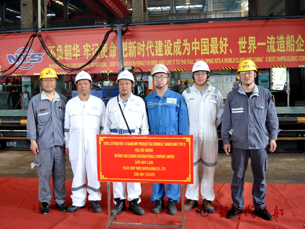 On May 3, 2023, the Steel Cutting Ceremony of one 50,000 DWT Product Oil/Chemical Tanker (IMO Type 2) with Hull No.0405036 has been carried out successfully by New Times Shipbuilding Co., Ltd. The representatives from the owner CDB Leasing (International) Co., Ltd. and the representatives from the classification societies DNV and CCS attended and witnessed the ceremony together.