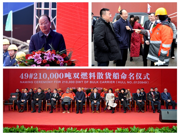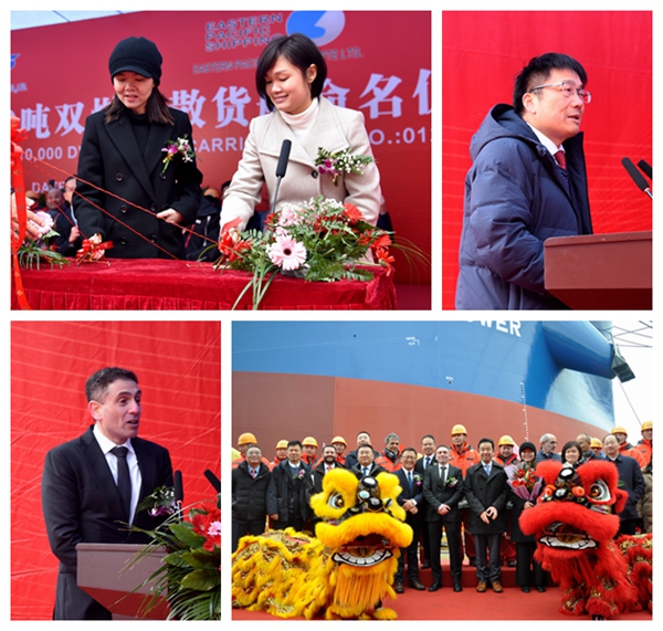 At 9:00 a.m., we held naming ceremony for one unit of 210,000 DWT Bulk Carrier with Builder's Hull No.0120849 that was built for Eastern Pacific Shipping Pte. Ltd. Our CEO Mr. Liu Haijin, Executive Deputy General Manager Mr. Zhang Yuyong, Deputy General Manager Mr. Yuan Heng, COO of Eastern Pacific Shipping Pte. Ltd Captain Anil attended this ceremony. Our CEO Mr. Liu Haijin and Commercial Director of Eastern Pacific Shipping Pte. Ltd Mr. Anatoly Robchinsky delivered speeches respectively. Godmother Ms. Pei Qi, Teo named the vessel for "MOUNT GOWER".