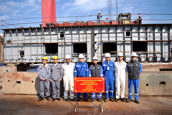 On October 19, 2020, the keel laying of No.6 325,000 DWT Ore Carrier has been carried out successfully by New Times Shipbuilding Co., Ltd. Our Deputy General Manger Mr. Zhu Hangang and representatives from the owner Pan Ocean and KR classification society attended this event.