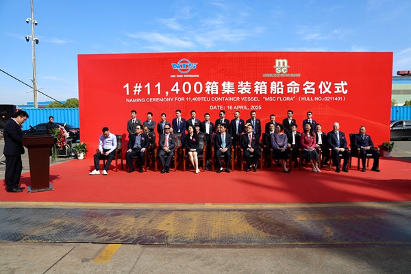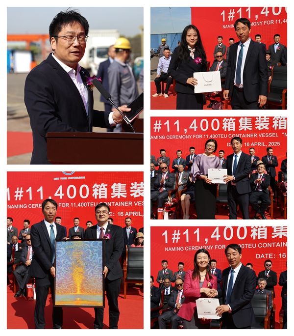 On 16 April, 2025, we held naming ceremony for two units of 8,100 TEU Container Vessels with Builder's Hull Nos.0208103 and 0208109 together with one unit of 11,400 TEU Container Vessel with Builder's Hull No.0211401. Our Executive Deputy General Manager Mr. Zhang Yuyong, General Manager Assistant Mr. Xu Zhenyu, MSC site manager Mr. Chen Yukun, BV Marine&Offshore China, New Construction Manager Mr. Christophe Vaes,ABS China Central Area General Manager Mr. Song Aimin, LR Deputy PM Mr. Liu Yi and other VIP guests attended this ceremony.