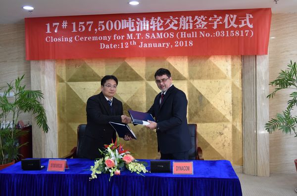 On January 12, 2018, the closing ceremony for No.17 157,500 DWT Crude Oil Tanker was held at the meeting room on 8th floor of New Times Office Building. Our Executive General Manger Mr. Zhang Yuyong and Mr.Sorin Mihailescu, the representative from Owner Dynacom attended this ceremony. The delivery documents for this ship were successfully signed by both parties.