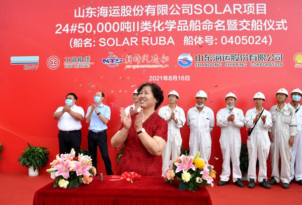 On August 16, 2021, e-closing for 24# 50,000 DWT Product Oil/Chemical Tanker (IMO II Type) was held at the meeting room on 8th floor of New Times Office Building. Our CEO Mr.Liu Haijin and Deputy General Manager & Executive Director Mr. Yuan Heng were present. Mr. Zhang Yuyong Executive Deputy General Manager of New Times Shipbuilding Co., Ltd.,  Mr. Xu Tao Vice General Manager of Shandong Shipping Corporation and the representive from ICBC Financial Leasing Co., Ltd. signed the delivery documents via video and email. The vessel was smoothly and successfully delivered by us and accepted by the Owner. On the same day, Godmother Mrs. Huang Yinfang named the vessel for "SOLAR RUBA".