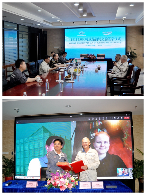 下午1:00,公司在八樓會議室舉行船舶簽字交付儀式,41#115000噸油船交付船東運營,該船的船東是挪威船東Frontline,總長249.9米,兩柱間長245.2米,型寬44米,型深21.5米,設(shè)計吃水13.6米,結(jié)構(gòu)吃水15.2米,載重115000噸,入LR船級社。FRONTLINE在我們公司共訂制了船舶41艘,目前己交付了33艘。