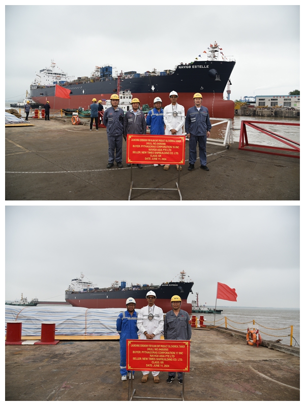 6月11日,公司又迎來船舶交付、下水喜事:41#115000噸油船交付、48#50#50000噸Ⅱ類化學品船順利出塢。