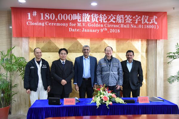 1月9日,公司舉行簽字交船儀式,1#180000噸散貨船順利交付船東。公司總經(jīng)理劉海金、常務(wù)副總經(jīng)理張玉永與船東一起出席儀式。