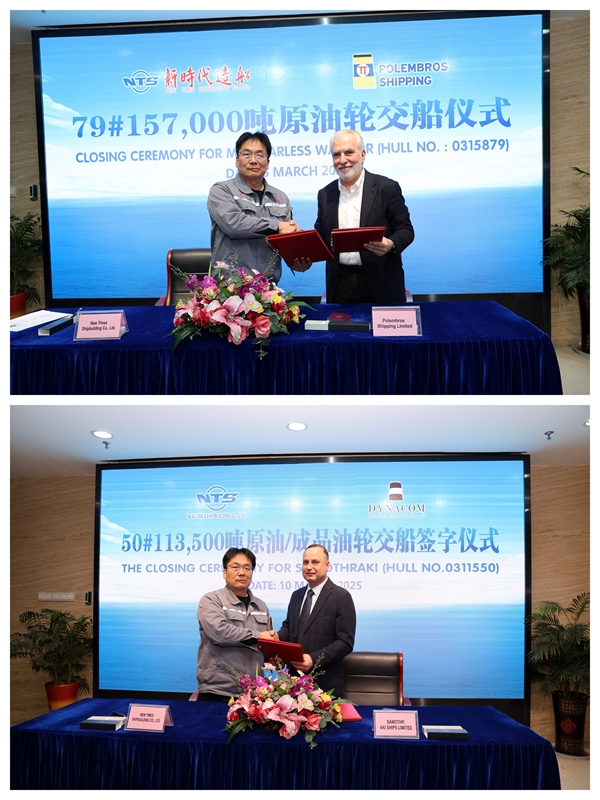 3月5日、10日,公司分別與希臘船東Polembros公司、希臘船東Dynacom公司簽署交船文本,79#157000噸油船、50#113500噸油船相繼交付船東運營,80#157000噸油船也將于近期交付。