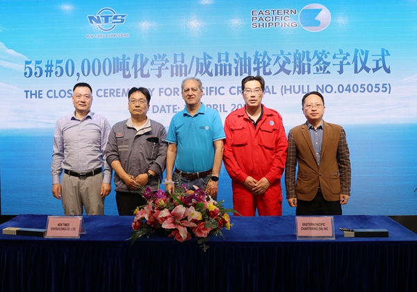 4月25日上午,55#50000噸Ⅱ類化學品船簽字交付儀式在辦公樓八樓會議室舉行。