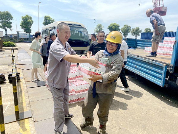 后勤部門積極做好后勤保障工作,隨時給一線員工提供舒適的就餐和歇息空間,為施工現(xiàn)場足量提供飲用水,同時為分段制造部等部門提供綠豆飲品,及時送至施工人員手中。