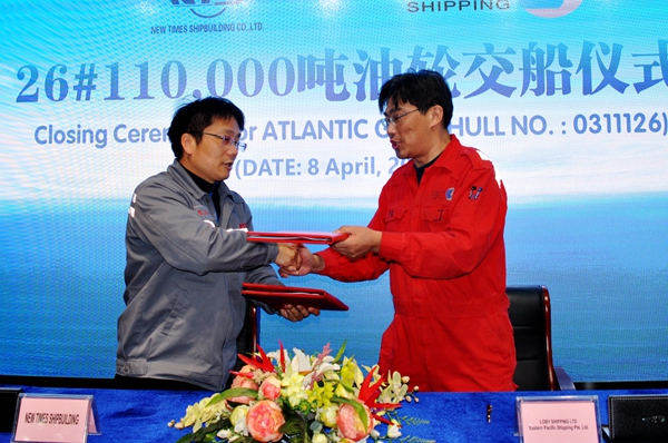 4月8日上午,公司在八樓會(huì)議室舉行船舶簽字交付儀式,26#110000噸油船成功交付?偨(jīng)理劉海金、常務(wù)副總經(jīng)理張玉永與新加坡船東Eastern Pacific Shipping Pte. Ltd.(EPS)代表現(xiàn)場(chǎng)經(jīng)理倪杰等嘉賓共同出席儀式,雙方簽署交船文本,見證合作成果達(dá)成,并力求在以后工作中取得新突破,續(xù)寫新船項(xiàng)目建造新篇章。