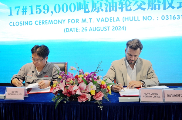 8月26日下午,公司在辦公樓八樓會議室舉行船舶簽字交付儀式,17#159000噸原油船交付希臘船東運營。