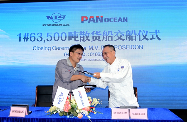 韓國(guó)船東Pan Ocean Co., Ltd.在我們企業(yè)共訂制了3艘63500噸散貨船,今天交的是該系列船舶的第一艘。