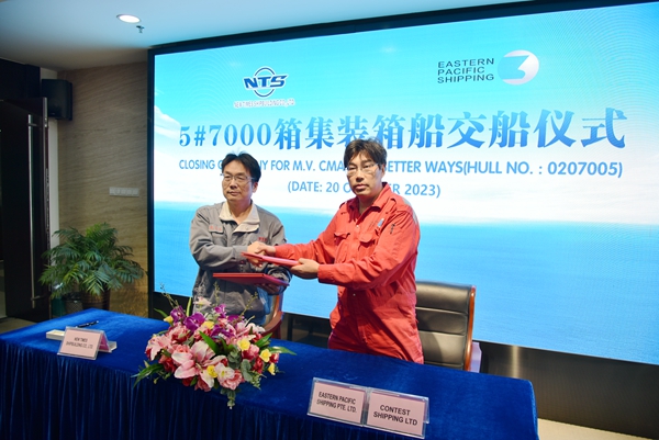 10月20日上午,公司在八樓會議室舉行船舶簽字交付儀式,常務(wù)副總經(jīng)理張玉永、副總經(jīng)理袁衡與船東EPS公司代表倪杰出席活動。張玉永與倪杰代表雙方在交船文本上簽字,5#7000箱集裝箱船正式交付船東運營。