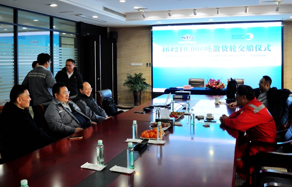 3月24日上午,公司在辦公樓八樓會議室舉行船舶交付簽字儀式,46#210000噸雙燃料動力散貨船成功交付船東Eastern Pacific Shipping Pte. Ltd.(EPS)公司運營。