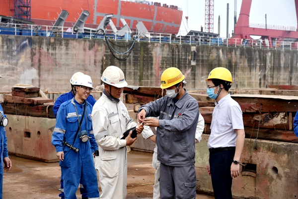 6月25日,3#63500噸散貨船上臺合攏龍儀式在西區(qū)1#塢舉行,公司總經(jīng)理助理徐震宇與韓國船東PanOcean公司代表共同出席儀式。63500噸散貨船船長199.9米,船寬32.26 米,船深18.9米,結構吃水13.5米,載重噸63,500MT。
