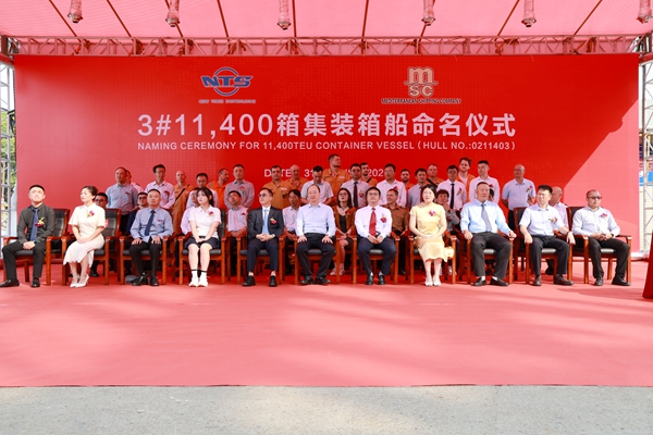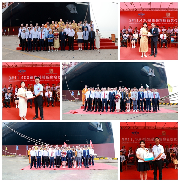 8月31日,公司隆重舉行船舶命名儀式,2#3#4#11400箱LNG雙燃料動力集裝箱船命名為“MSC MUGE”“MSC HORTENSE”“MSC PROCIDA”號?偨(jīng)理劉海金、常務(wù)副總經(jīng)理張玉永、總經(jīng)理助理徐震宇與船東MSC代表、船級社代表等嘉賓出席命名儀式。