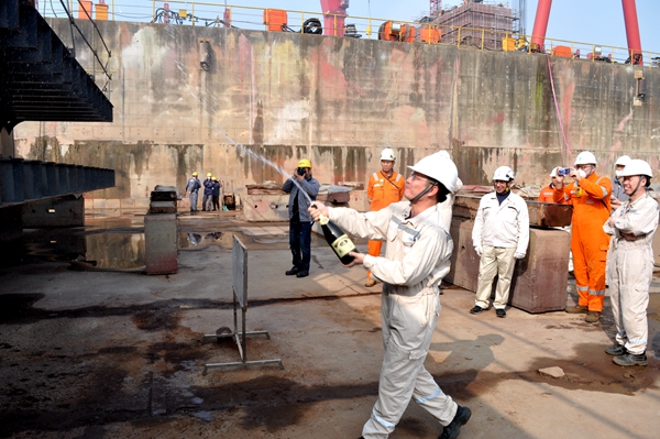 8:58,挪威船東Frontline現(xiàn)場船東經(jīng)理Raman率領監(jiān)造師團隊出席42#115000噸油船進塢合攏儀式,該型油船總長249.9米,型寬44米,型深21.5米,設計吃水13.6米,結(jié)構(gòu)吃水15.2米,載重115000噸,入LR船級社。
