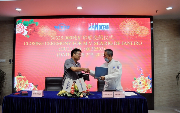 上午8:30,公司建造的3#325000噸超大型礦砂船交船簽字儀式在辦公樓八樓會(huì)議室舉行,總經(jīng)理劉海金、常務(wù)副總經(jīng)理張玉永與韓國(guó)船東Pan Ocean公司代表Choi Nakjin先生一起出席儀式,張玉永與Choi Nakjin先生共同簽署交船文本,3#325000噸超大型礦砂船正式交付船東。該船總長(zhǎng)340米,型寬62米,型深29.5米,結(jié)構(gòu)吃水21.4米,載重32.5萬(wàn)噸,入KR船級(jí)社。韓國(guó)船東Pan Ocean公司在公司共訂制了6艘325000噸礦砂船,此次交付使用的是該系列船中第三艘。