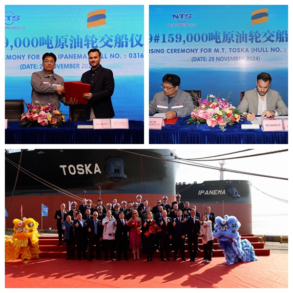 11月27日上午,公司在新區(qū)舾裝碼頭舉行船舶命名儀式,18#19#159000噸原油船先后被成功命名為“TOSKA”“IPANEMA”號。