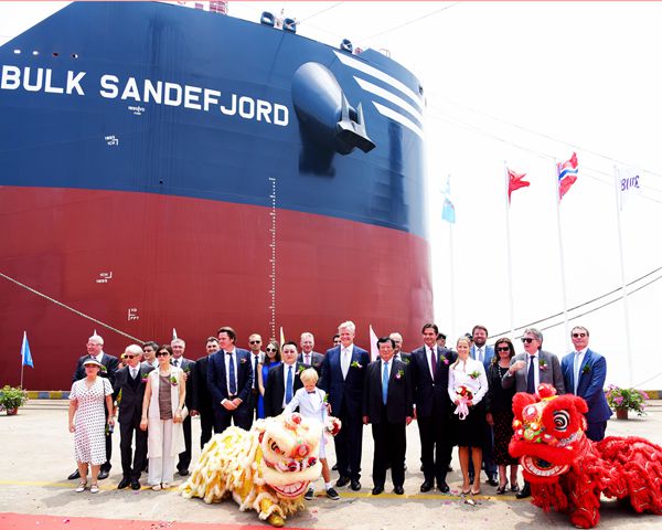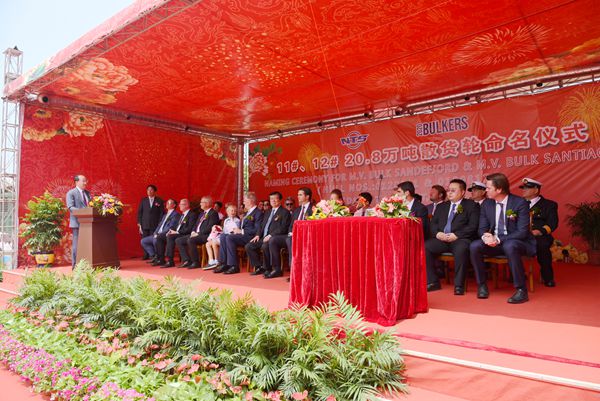 8月7日上午,公司隆重舉行命名儀式,為兩艘208000噸散貨船命名。董事長袁凱飛、總經理劉海金、常務副總經理張玉永,公司領導徐震宇、袁衡與挪威船東2020 BULKERS公司代表一起出席活動;顒由,11#、12#208000噸散貨船被命名為“BULK SANDEF JORD”、“BULK SANTIAGO” 號。