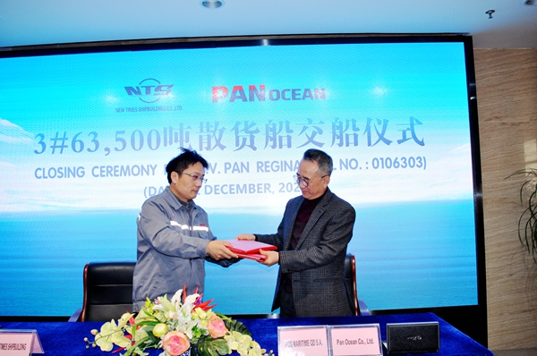 2020年即將過去,又一艘船舶完工交付,這是企業(yè)年度交付的第27艘船舶,年度累計(jì)交付船舶442.07萬載重噸。12月22日上午,公司在八樓會議室為3#63500噸散貨船舉行交船簽字儀式,公司總經(jīng)理劉海金、常務(wù)副總經(jīng)理張玉永與韓國船東Pan Ocean Co., Ltd.代表一起出席活動,簽署交船文本,共同見證該船正式交付運(yùn)營。