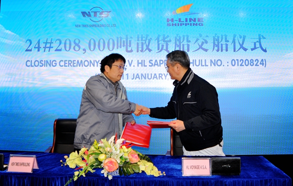 1月11日上午,公司在辦公樓八樓會議室舉行24#208000噸散貨船簽字交付儀式,總經(jīng)理劉海金、常務副總經(jīng)理張玉永與韓國船東H-LINE公司代表Young Hwan Lee先生一起出席,常務副總經(jīng)理張玉永與韓國船東H-LINE公司代表Young Hwan Lee先生共同簽署交船文本,24#208000噸散貨船正式交付船東運營。