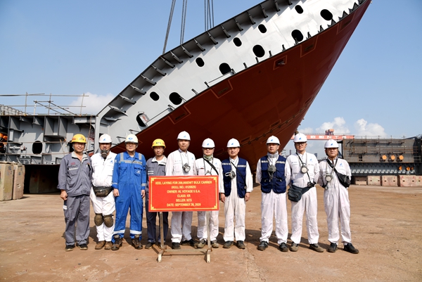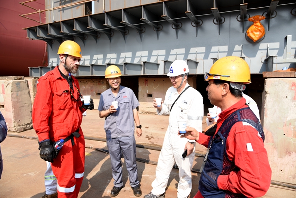 副總經(jīng)理朱韓鋼、總經(jīng)理助理丁柏英分別與兩船的船東代表共同出席活動(dòng),見證船舶開始合攏建造。